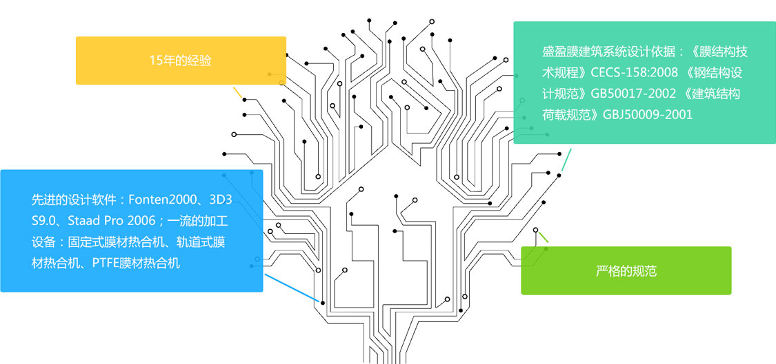 盛盈公司汇集了一批国内较早从事膜结构工程的精干技术人才和高素质的设计师;公司拥有一批高水平、经验丰富的安装队伍和工程管理团队。秉承“追求卓越、缔造完美”的建筑理念,坚持以最先进的技术、先进的膜材加工设备、现代化的施工管理、优良的服务和丰富的施工经验为顾客缔造完美的膜结构建筑。
